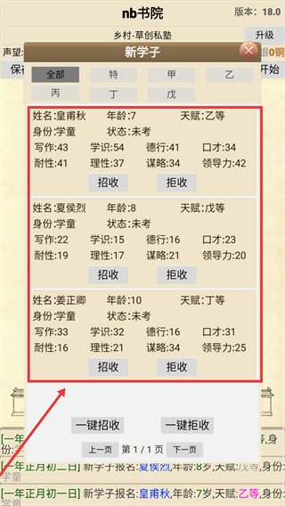 3、安排春季与夏季两次招生大会,详细查看学子属性数值,挑选合适对象提升整体成绩。
