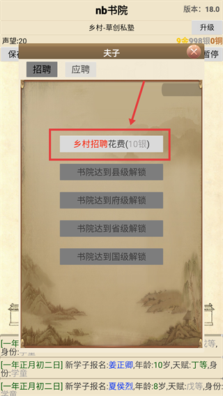4、夫子招聘界面中乡村级别需花费【10银】,县级及以上需书院升级后解锁对应选项。