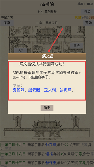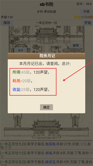 1、查看院务日记了解【45银】-【120声望】-【20银】-【25银】的收支,合理规划书院运营方向。