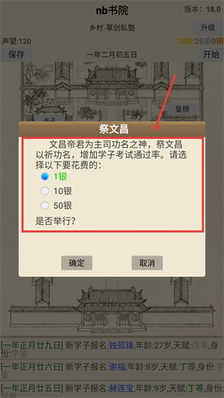 2、选择【1银】祭祀文昌帝君,增加学子考试通过率,为科举备考助力。
