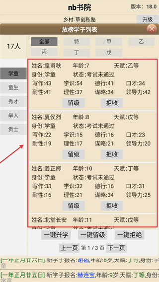 4、查看放榜学子列表,依据天赋成绩选留级或拒收,优化书院学子培养质量。