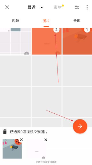 2、在素材选择界面,选中【所需素材】后点击【右下角箭头】,进入视频编辑的主界面。