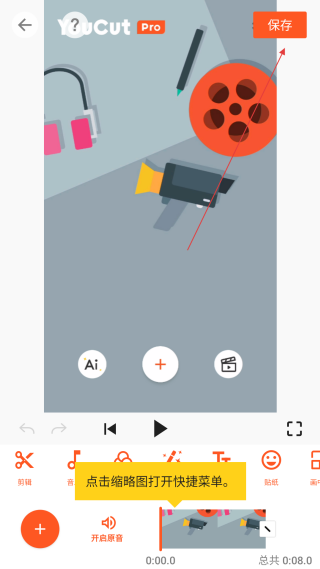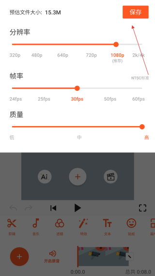 3、在编辑界面可使用【剪辑、音乐】等功能处理素材,完成后点击右上角【保存】,进入导出参数设置界面。