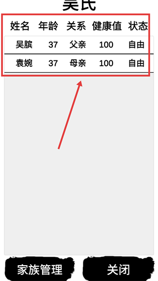 3、查看家族成员的【姓名】【年龄】【健康值】信息,了解初始背景,为后续发展规划提供参考。