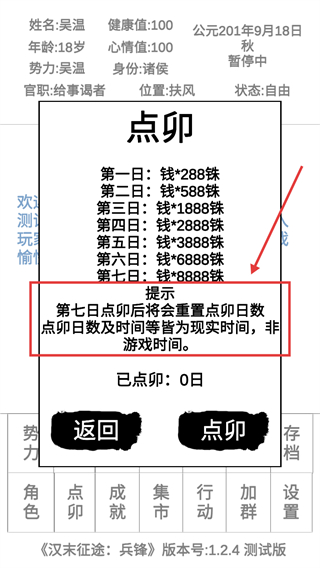 4、在点卯界面点击【点卯】领取每日铜钱奖励,注意奖励重置规则按现实时间计算。