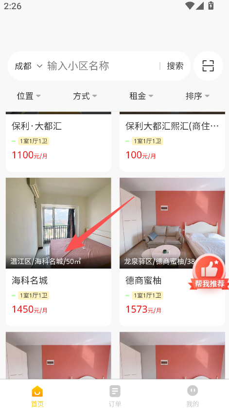 2、使用位置方式租金排序选项,筛选适配的房源。