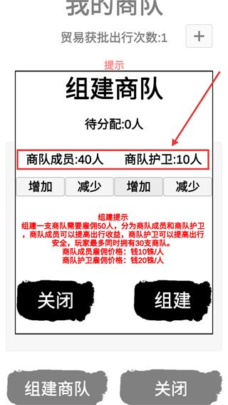 1、组建商队时,合理设置【商队成员-40人】与【商队护卫-10人】数量,提升贸易收益且增加出行次数。
