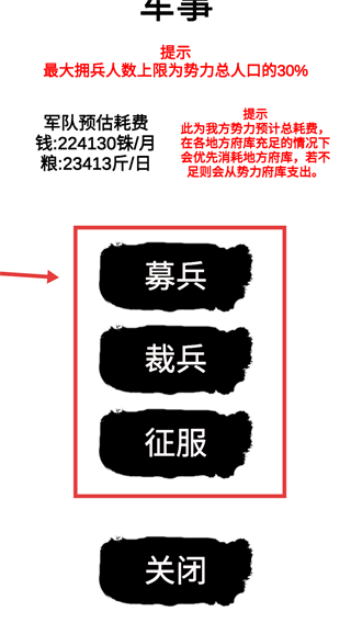 3、募兵时控制数量不超总人口30%,关注【军队预估耗费钱-224130钱/月】,平衡钱粮消耗稳定军力。