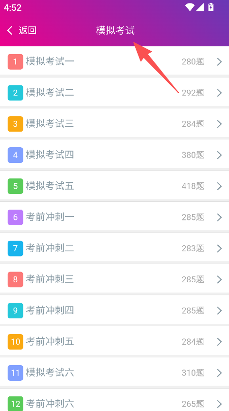 2、题库分类清晰区分模拟考试与考前冲刺,按类别呈现对应题目资源,便于按需选择适配的练习内容。