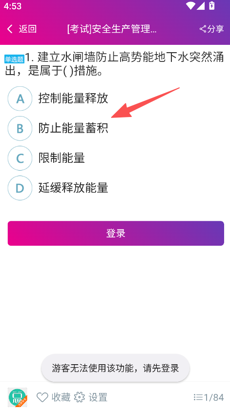 3、呈现题目内容并支持答题操作,游客需登录后使用,衔接完整的备考刷题练习流程。