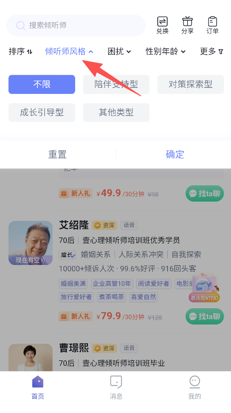 1、打开软件进入首页,筛选倾听师风格类别。