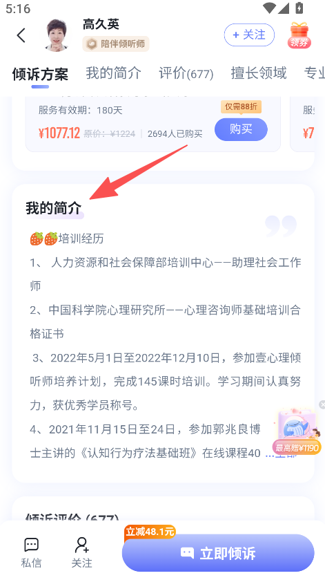 2、展示倾听师简介内容,含培训经历擅长领域等信息,辅助了解服务提供方的专业背景情况。
