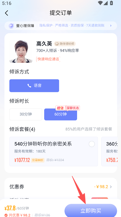 3、选择倾诉方式时长套餐,提交订单点击立即购买。