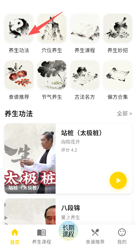 1、展示多类养生板块,含养生功法穴位养生等,提供不同养生方向的内容选择入口。