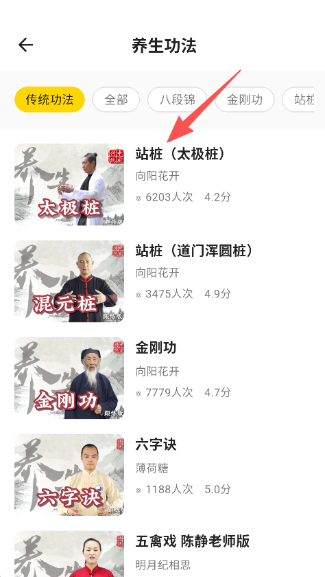 2、呈现养生功法具体内容,标注播放人次评分,助力了解内容情况并选择学习内容。