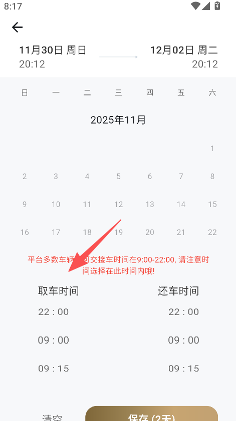 3、标注平台多数车辆交接时间范围,明确取还车时段,便于规划租车事务的具体时间安排。