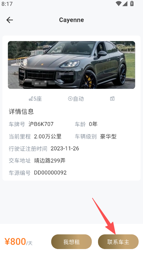 3、点击目标车辆查看详情,选择联系车主或我想租。