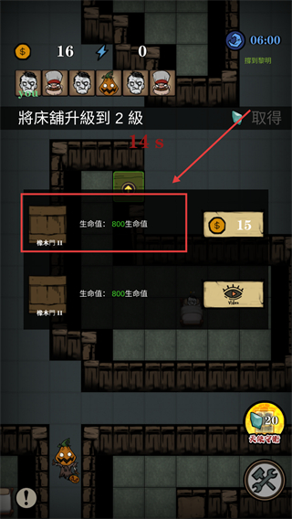 3、优先升级【橡木门II】提升生命值,消耗【15】金币增强防御,抵御怪物攻击。