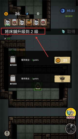 1、用25金币将【潮湿床铺】升级到【2级】,提升金币获取速度,为后续防御布局攒资源。