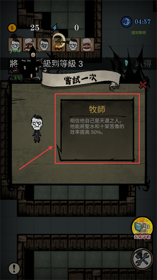 2、选择【牧师】角色,他能提升【圣水】-【十字架】效率50%,增强防御道具的生存辅助能力。
