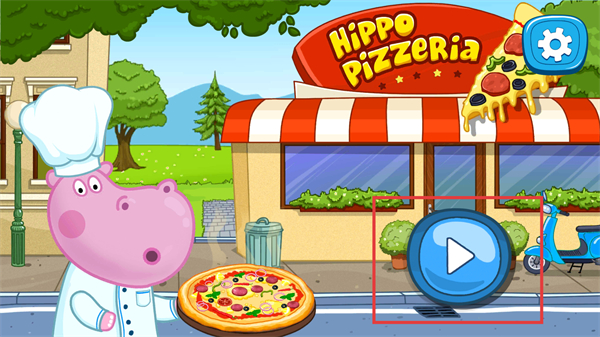 1、点击界面中的【蓝色按钮】,进入【Hippo-Pizzeria】的披萨店场景,开启披萨制作与餐厅经营的游戏流程。