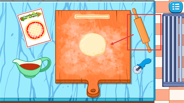 3、按照指引取用【擀面杖】,将面饼擀至合适形状,这是披萨制作的核心基础步骤,配合旁侧食谱准备后续配料。