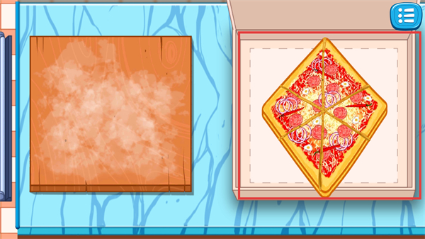 4、将制作完成的披萨分装到【披萨盒】中,完成成品打包环节,以便后续交付顾客,获取对应的餐厅经营收益。