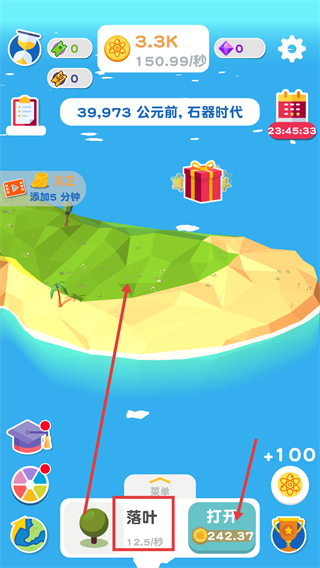 1、处于【39,982公元前·石器时代】时,点击右下角原子图标获取资源,同时点击“小石头”右侧【打开】按钮,开启其3.26/秒的资源生产。