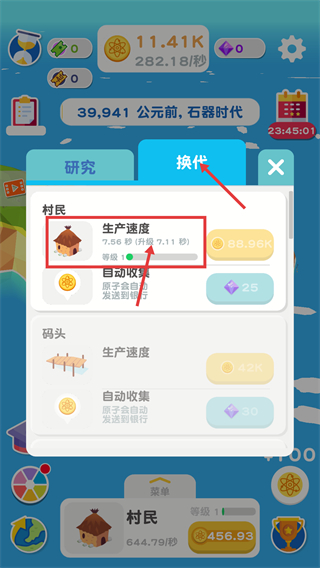 3、进入【换代】界面,选择升级“村民”的生产速度,提升村民的资源产出效率(升级后速度从7.56秒优化为7.11秒)。