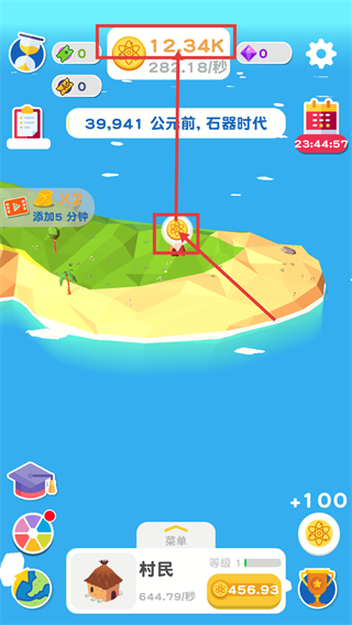 4、点击岛屿上出现的原子图标,直接收集资源,增加总原子储备(当前显示12.34K),加速资源积累进程。