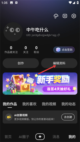 2、在个人中心页面,找到【编辑资料】按钮并点击,进入资料编辑界面,可修改账号相关信息。