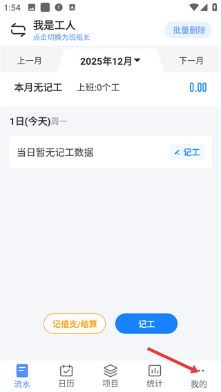 1、在记工流水页面,点击底部【我的】入口,进入个人中心,可管理账号及功能设置。