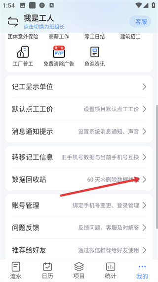 2、在个人中心页面,找到【数据回收站】选项并点击,可查看60天内删除的记工数据。