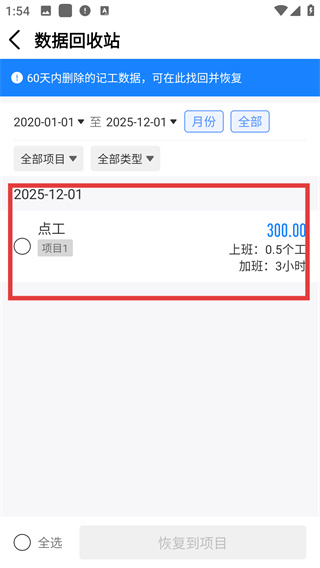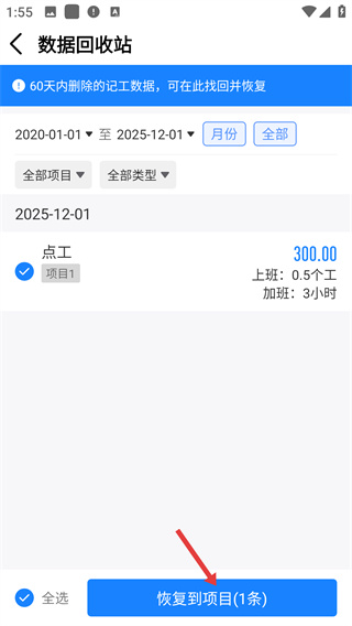 4、勾选目标记工数据,点击【恢复到项目】按钮,即可将删除的数据恢复至对应项目中。