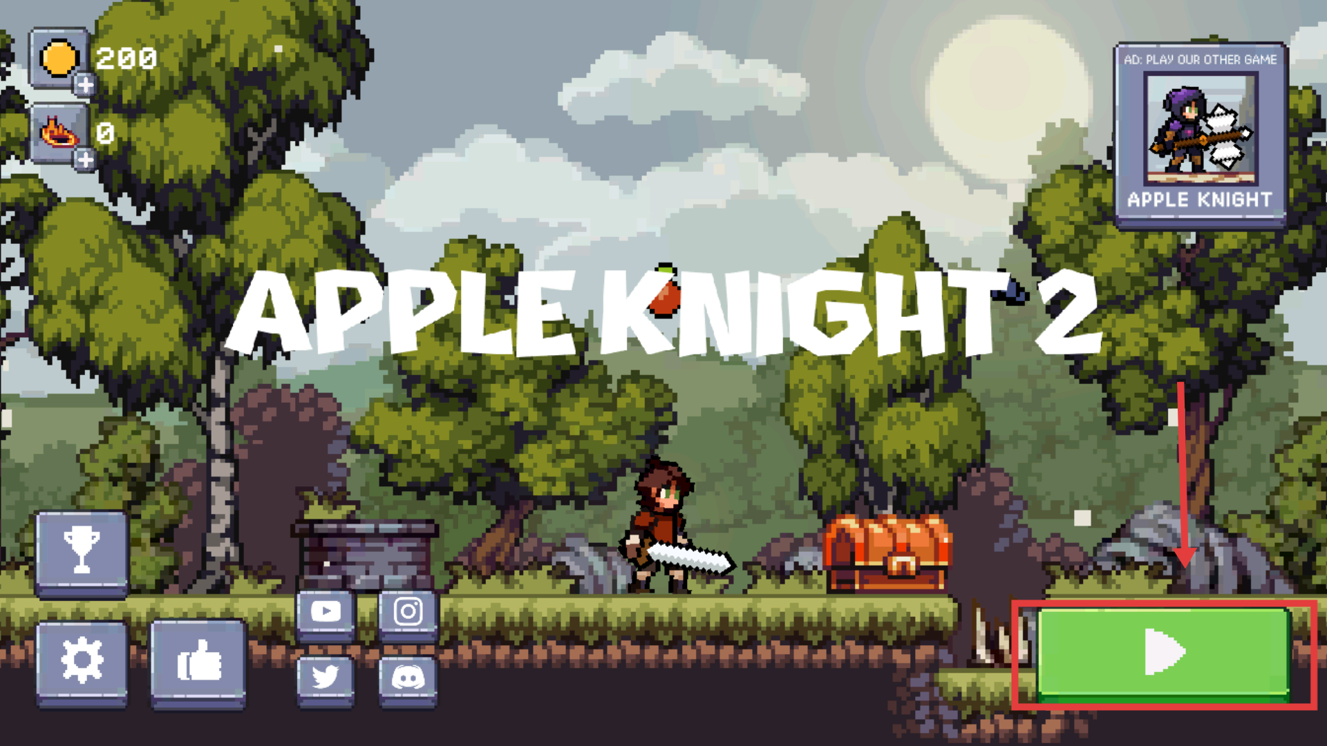1、进入【AppleKnight2】主界面,点击绿色开始按钮,开启像素风冒险,探索地下城收集装备提升战力。