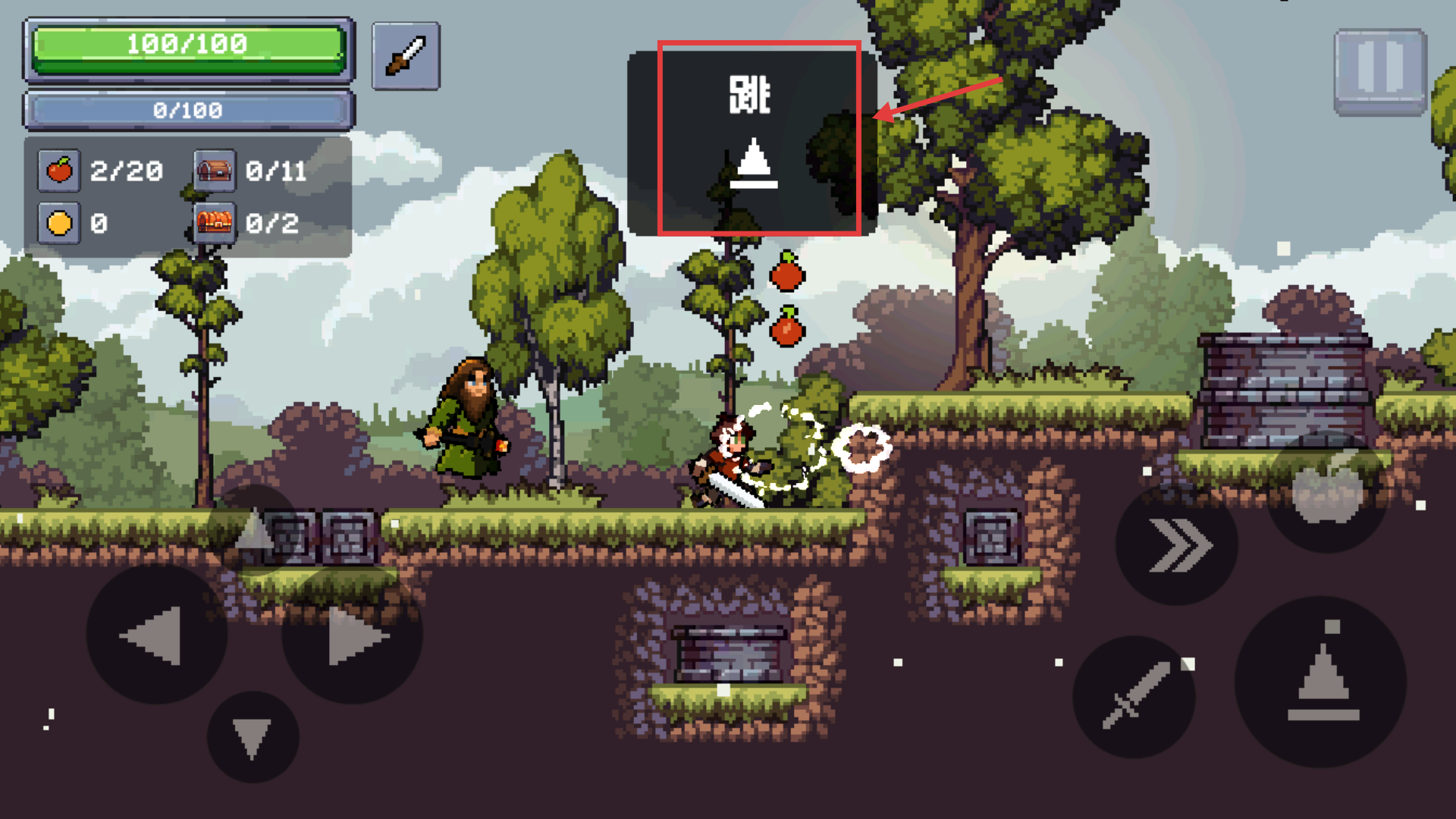 3、遇到高处或空中敌人时,点击【跳】按钮跃起躲避攻击,同时收集空中苹果资源,增强续航能力。