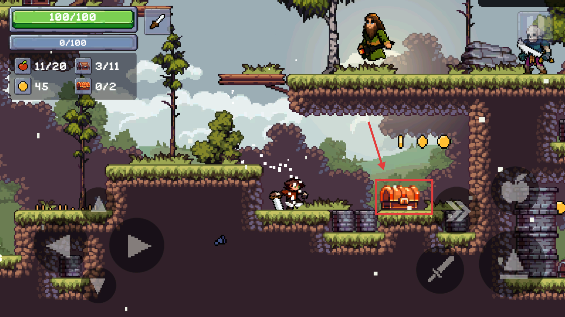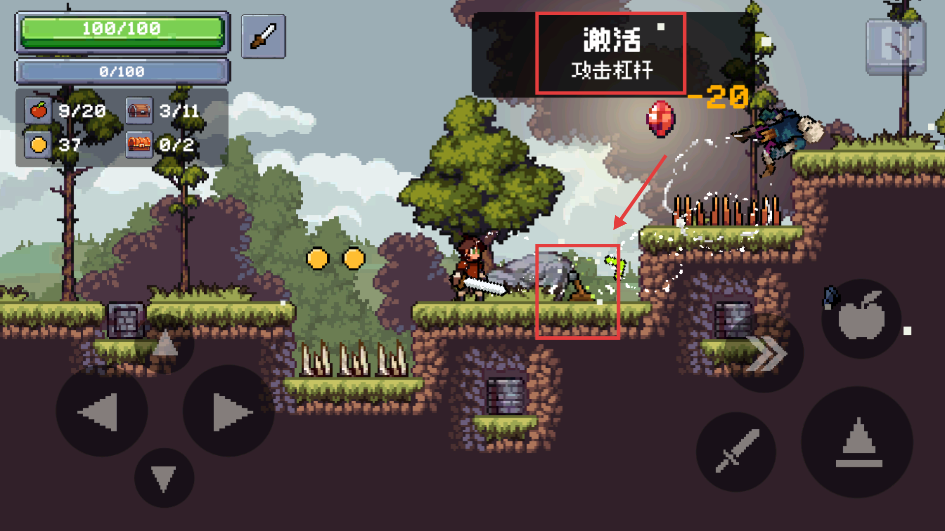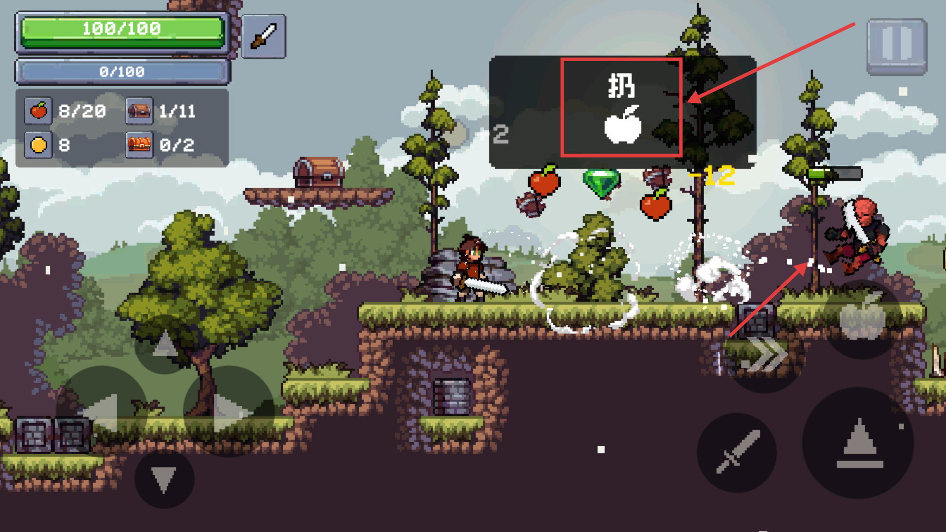 1、操控方向键移动角色,点击苹果图标投掷攻击远处敌人,挥剑打碎箱子收集金币与道具。