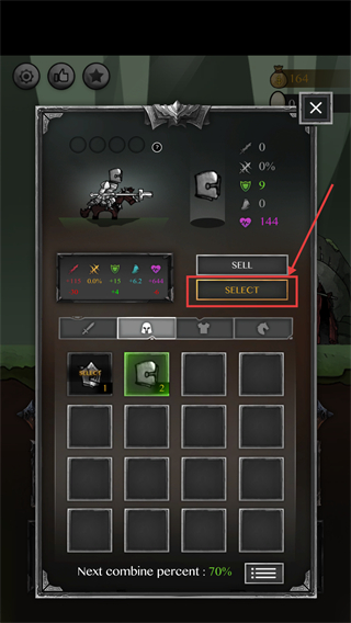 1、进入装备选择界面时,点击【SELECT】按钮选择【头盔】装备,可提升血量等属性,助力后续战斗。
