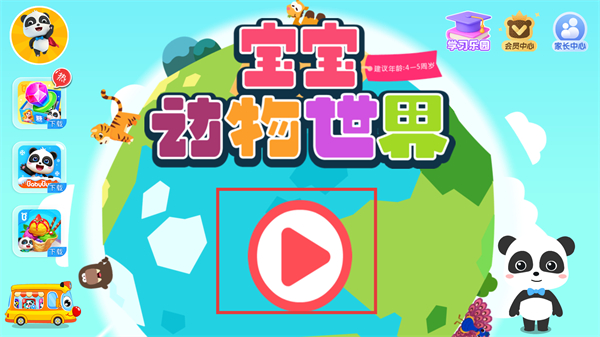 1、点击界面中的【播放按钮】,进入【宝宝动物世界】的游戏场景,该游戏适配【4-5周岁】宝宝,开启动物认知的早教体验。