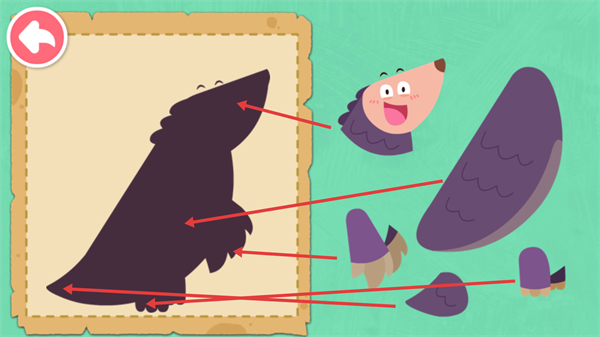 3、将【穿山甲】的各部件对应到剪影的对应位置,完成拼图操作,通过该互动认识这一动物的外形特征。