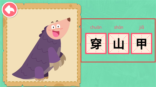 4、完成拼图后查看【穿山甲】对应的【chuān-shān-jiǎ】拼音与汉字,借助该环节学习动物的标准名称与读音。
