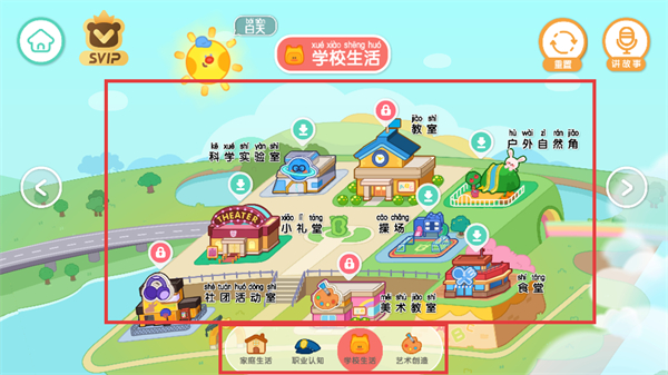 1、点击【学校生活】模块,选择已解锁的【科学实验室】等场景,进入对应的学校区域,开启校园相关的互动体验。