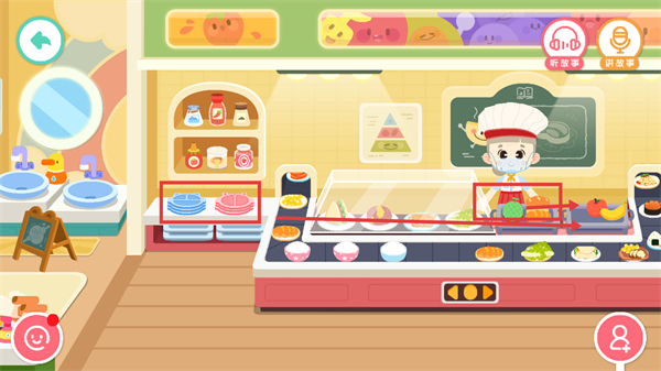 2、在食堂场景中,先选取【餐盘】,再从餐台挑选食材,完成餐食搭配,体验食堂就餐的互动流程。