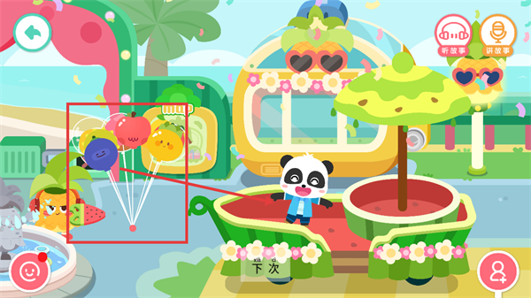 3、点击标注的【水果气球】道具,将其与当前场景的设施搭配,丰富互动内容,提升场景体验的趣味性。