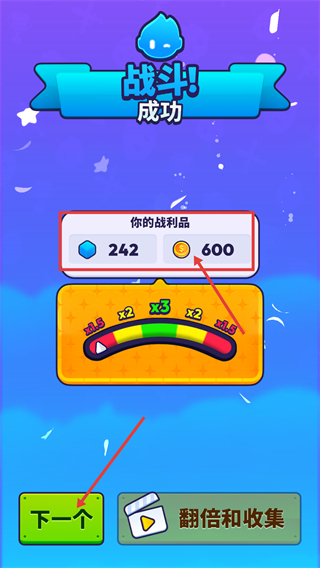 4、达成【战斗!成功】后,可获取【242】-蓝色晶体与【600】-金币的战利品,选择【下一个】继续挑战。