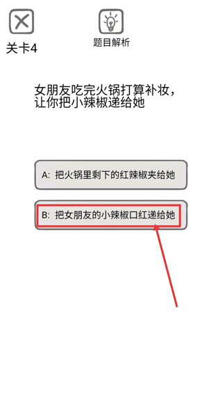 2、关卡4的题目中,女朋友补妆要小辣椒时,需选择【B:把女朋友的小辣椒口红递给她】,这是契合补妆场景的正确选项。