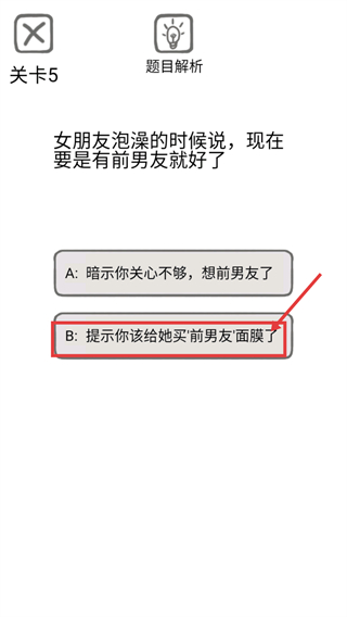 3、关卡5的题目里,女朋友泡澡说要前男友时,应选【B:提示你该给她买'前男友'面膜了】,匹配场景需求完成该题挑战。