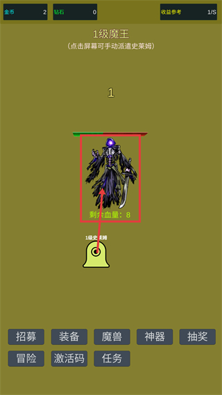 2、面对【1级魔王】,其【剩余血量:8】,可点击屏幕手动派遣【1级史莱姆】,同时关注顶部【金币】【钻石】的资源数值变化。
