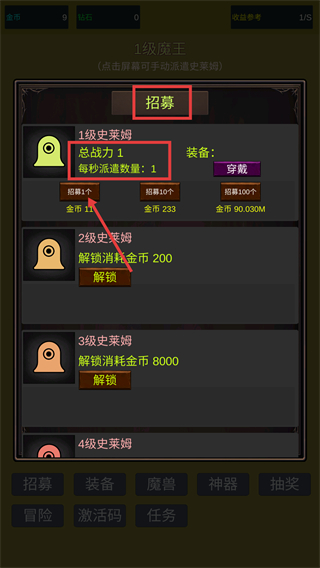 3、在【招募】界面中,消耗11金币招募【1级史莱姆-总战力1-每秒派遣数量:1】,后续可攒200金币解锁【2级史莱姆】提升战力。