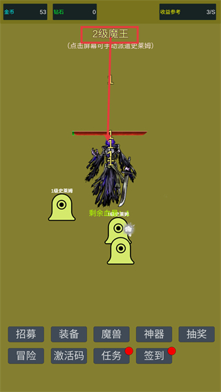 4、挑战【2级魔王】时,依靠已积累的史莱姆进行攻击,同时留意底部【任务】【签到】的红点,及时领取奖励提升【收益参考】效率。
